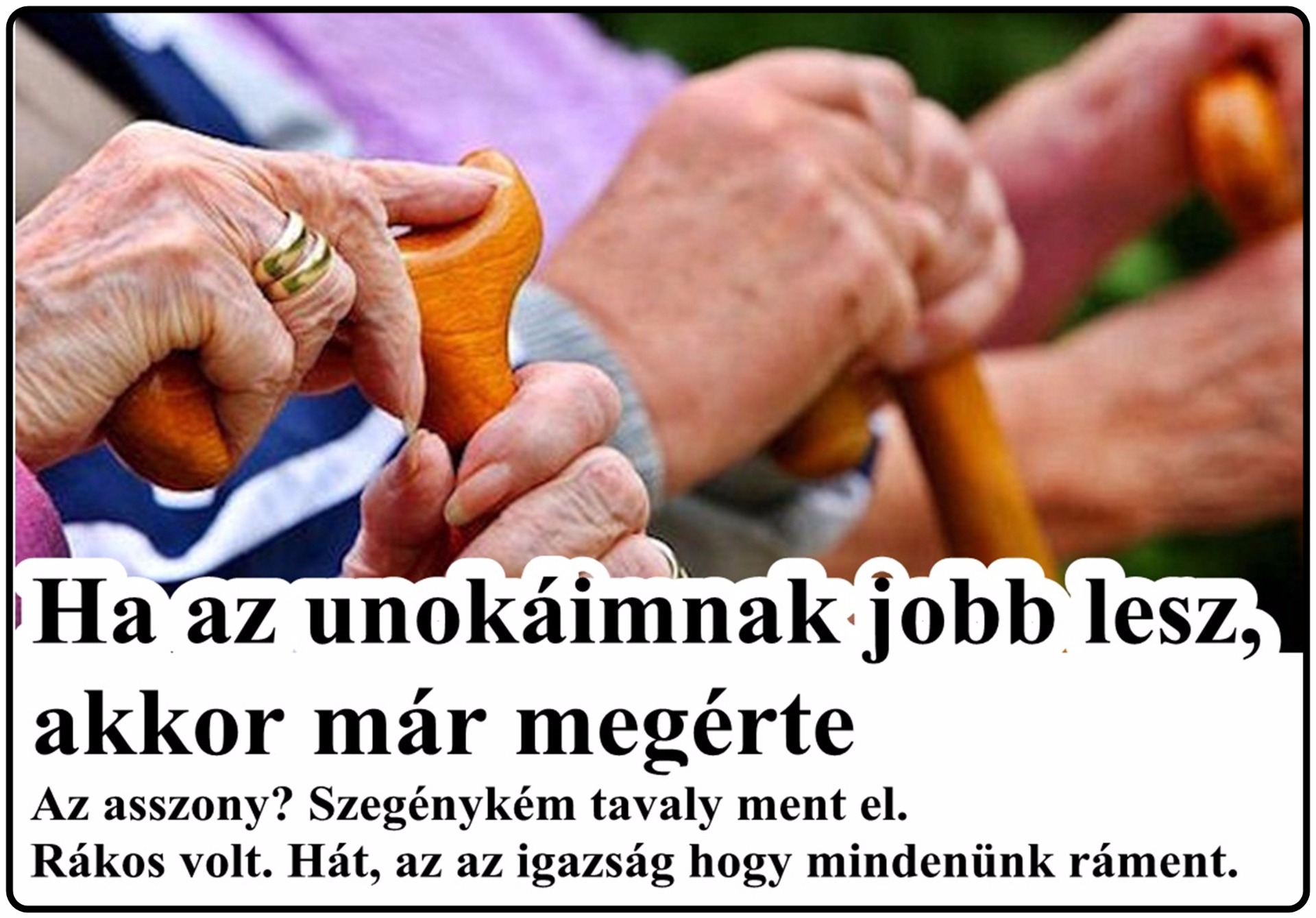 Az asszony? Szegénykém tavaly ment el. Rákos volt. Hát, az az igazság hogy mindenünk ráment. Egy hónapja csak a gyógyszerezés, kezelés negyvenbe került, meg aztán az orvosok, az ajándékok. Nem várták el persze, na de azért csak tudja az ember, hogy kéz kezet mos.